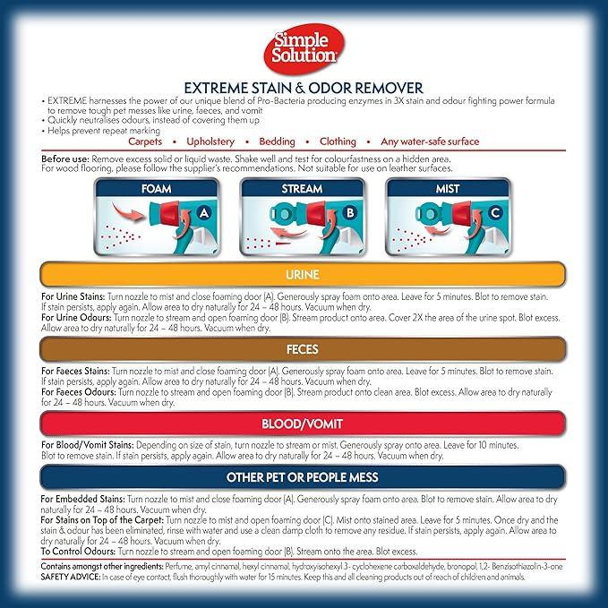 - EXTREME ENZYMATIC CLEANER: This professional strength spray consists of a powerful enzyme formula three times stronger than our regular formula, specialized for breaking down, eliminating, and permanently neutralizing both new and old stains and odors.