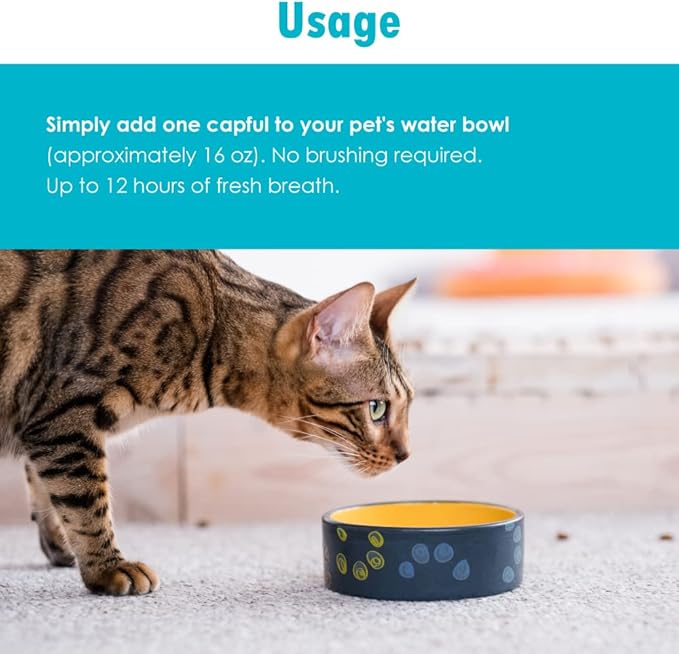 - π¦· Ease of Use: Simply add one capful to your pet's water bowl (approximately 16 oz). No brushing required. Up to 12 hours of fresh breath.