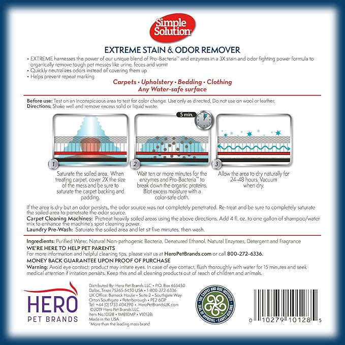 - EXTREMELY EFFECTIVE: Simple Solution Extreme Stain and Odor Remover is three times stronger than our regular stain and odor remover, eliminating the toughest dog and cat messes faster