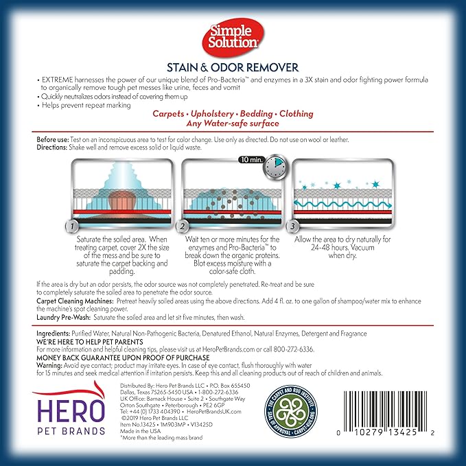 - SPRING AWAY FROM MESSES: Simple Solution Spring Breeze Extreme Stain and Odor Remover is three times stronger than our regular stain and odor remover, eliminating the toughest dog and cat messes faster.