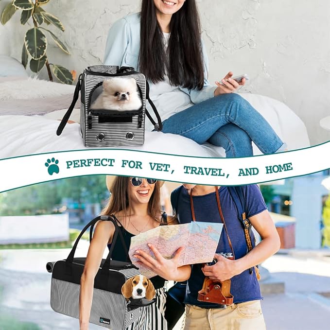 - AIRLINE APPROVED PURSE PET CARRIER: Airline compliant and fits under most airplane seats, this tsa approved pet carrier is easy to carry on for any travel and outdoor activity. The handle strap is sturdy and durable, allowing you to carry this dog tote bag by hand or on your shoulder. The pet carrier also comes with a front large pocket and a mesh pocket on the back to store pet stuff, treats, food, toys, or personal items, phone and cards, making it the most convenient cat carrier for any trip.