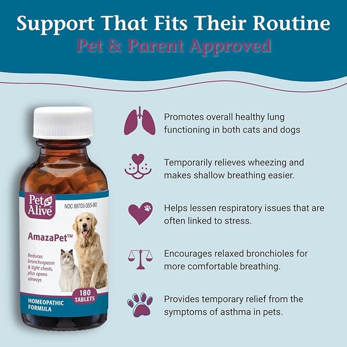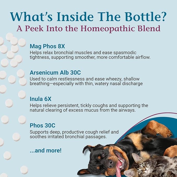 - Easy-to-Use Tablets – Convenient tablets can be given directly by mouth or as directed by your pet care professional, making daily respiratory support simple and stress-free for pets of all sizes.