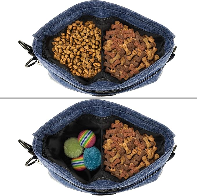 - INNOVATIVE MAGNETIC OPENING DESIGN: Our treat pouch uses the innovative one-hand magnetic opening design, you can easily open or close the main bag. In additional, the main bag consists of two separate bags, you can put different dog food or toys separately.