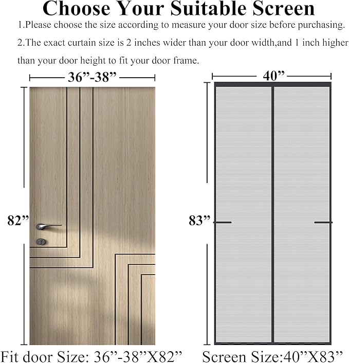 - SCREEN SIZE 40"x83",FITS ALL DOOR UP TO 38"x82": If your door frame measures 38" or less in width and 82" or less in height,then this hanging magnetic screen doors for single door will be fit. Can be used as a replacement for a fixed sliding screen door and fits front, rear, interior or exterior,entry,patio, balcony, glass, garage, as magnetic screen door for sliding door. Important: Measure your door before ordering to be sure our screen for door with magnets will fit.