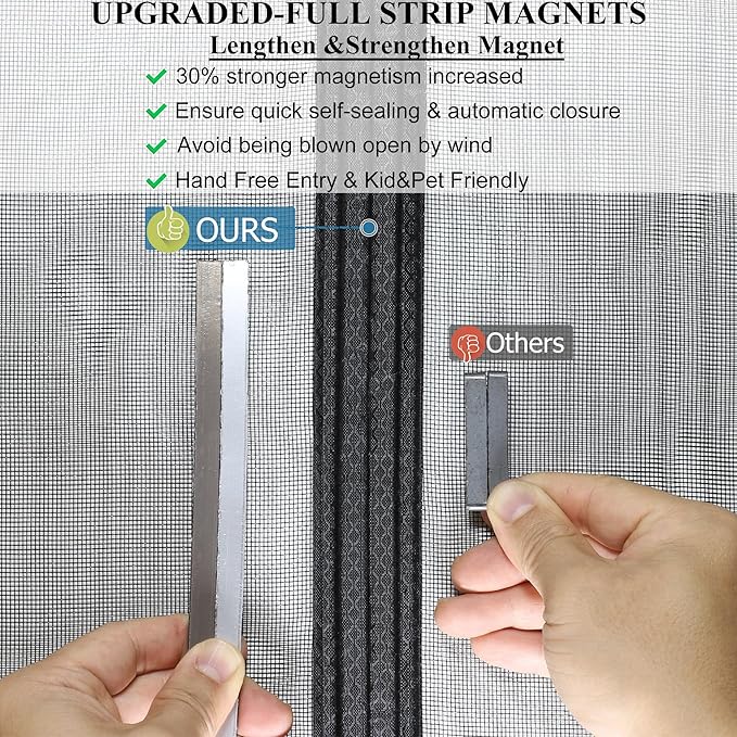 - Upgraded reinforcement line & WIND PROTECTION DESIGN:The unique reinforcement line design protects the top of door screen magnetic closure from ripping for longer usage time. And Unlike others mesh screen door with magnets ,we add 8pcs unique bottom sticks to to help keep the pet screen door closed even in wind gusts.