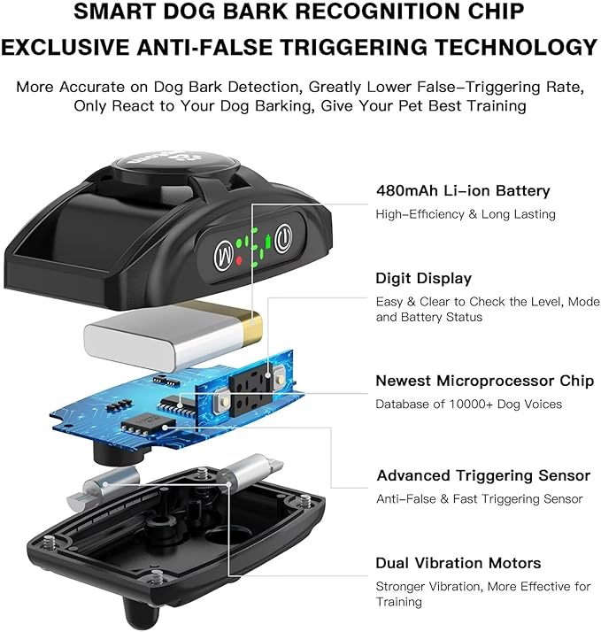 - Advanced Smart Dog Bark Recognition Chip: Laptom smart bark collar is designed with an advanced recognition chip with exclusive anti-false triggering technology, it will intelligently detect your dog's bark, and effectively filter other unrelated sounds from the environment to prevent false triggering. The collar will only activate when your dog barks with accelerated responsiveness, give your dog timely and correct training.