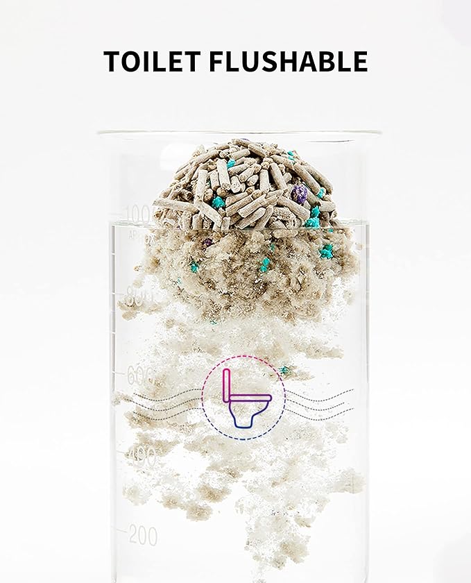 - Water Flushable: Made of natural ingredients, water dissolvable and flushable, you can directly pour the used cat litter into the toilet(Note: Please don't pour too much one time).