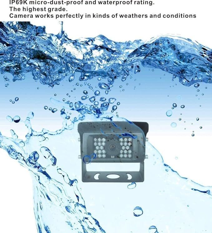 - 【HEAVY DUTY CAMERA】It is a color 1080P camera, provides super clear and real color image. The viewing angle is 120 degree. With waterproof rating IP69K(the highest level), with night vision. So it works perfectly in kinds of weathers. With Heavy duty, 10G vibration-proof rating, it works well with the vehicle which has intensive vibration in extreme conditions.