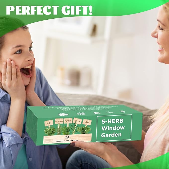 5 Herb Seeds Garden Starter Kit with Complete Planting Kit & Wooden Flower Box, Growing into Basil, Parsley, Rosemary, Thyme, Mint for Kitchen Windowsill Herb Garden DIY
