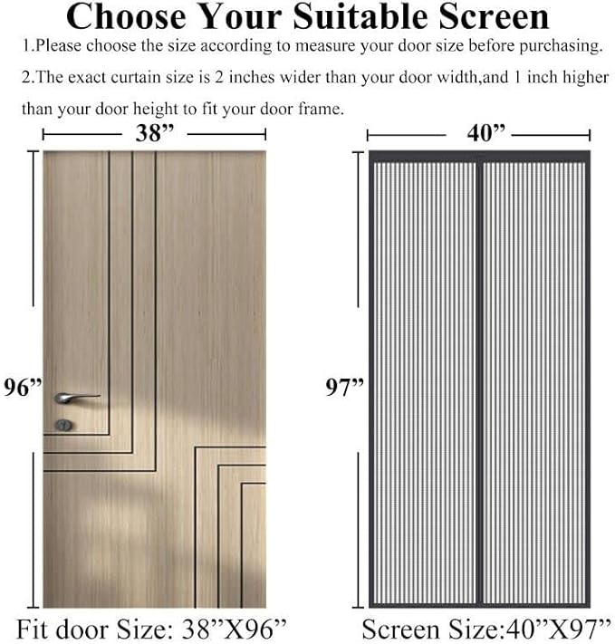 - Full-strip magnets for seamlessly Close:SCREEN SIZE 40"x97",FITS ALL DOOR UP TO 38"x96",Mpmedo Upgraded magnetic door screen,Full-strip magnets are used instead of individually placed magnets.The entire closing strip of the our screen doors is filled with 1-LONG-RECTANGULA magnets that allow our screen door magnets to close more quickly and seamlessly (NO GAPS!)behind you like magic and to help keep the door closed even in strong wind gusts.Good idea for screen door cover for front door doorway.