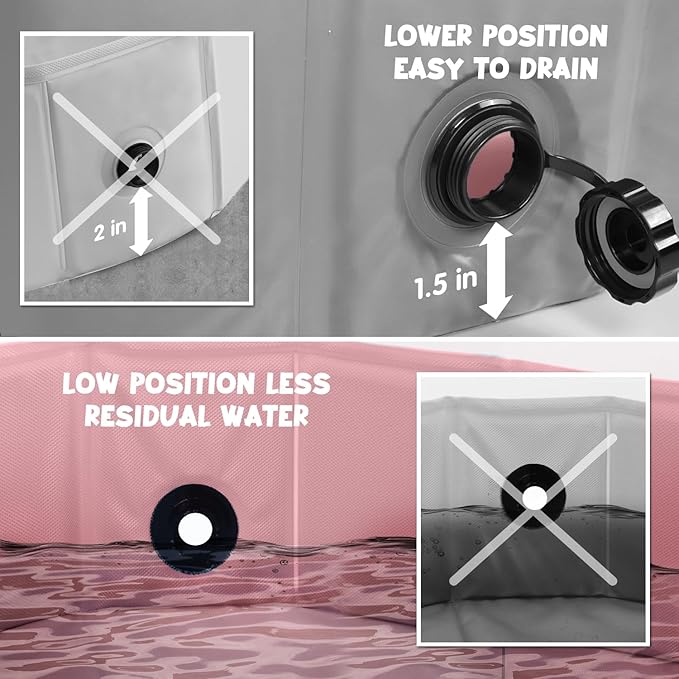 - DRAIN HOLE FOR QUICK RELEASE - Lower drain level and larger outfall for faster release. Mix vinegar, dish soap, and water to wash the inside of the dog bath if necessary. Air dry and store.