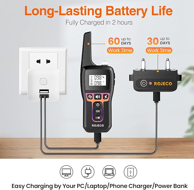 - 【USB Recharged Battery & Long Standby Time】Both bark collar and remote can be fully charged in 2 hours. The max battery capacity of receiver is 650mAh and can work 30 days. The max battery capacity of remote is 300mAh and can work 60 days