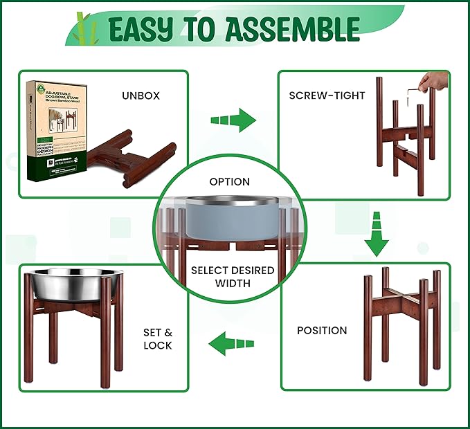 - Easy Assembly in Minutes β This water bowl stand sets up in just a minute. Stack the two parts and tighten with the screw. Place the dog water bowl of your choice on top of the platform and adjust the legs close to the bowl. When the stand perfectly fits the bowl, lock the rails with the bolts and nuts. Its now ready to add dog food or water to the feeder.