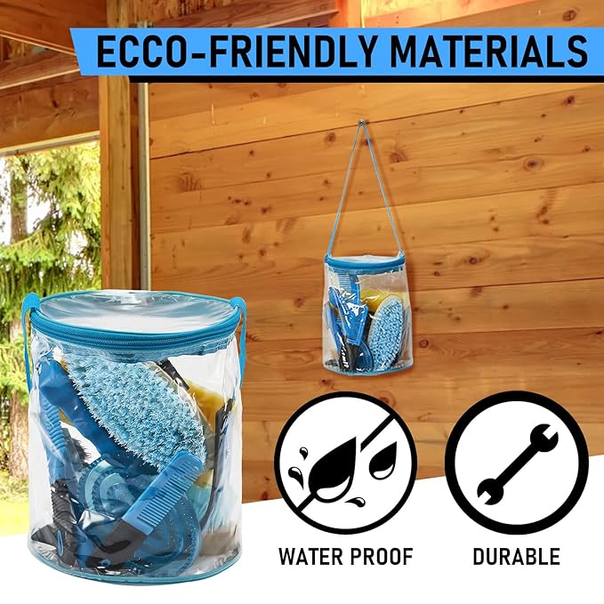 - Product Information: the horse grooming kit, includes a horse grooming tote bag, a oval massage curry, a hard brush, a soft brush, a sweat scraper, bathing sponge, a hoof pick with brush, a mane comb and a tail comb, a total of 9 pieces