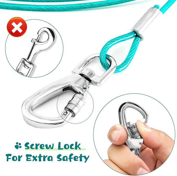 - Durable Superior Clip: The dog leads for outside has 360°free-rotating clip, which is lightweight, durable and rust-proof. Both ends will be easily connected to the ground pillar or screw pile. The spiral ring lock is used to ensure pet’s outdoor safety.