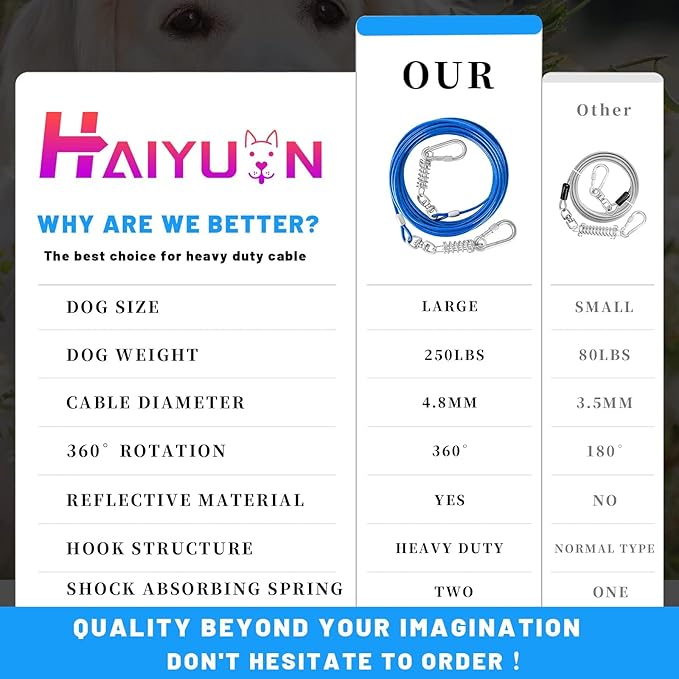 - STURDY DOG TIE OUT CABLE:The HaiYUAN multi-functional, multi-size, ultra-tensile pull cable provides greater range of motion for dogs. Designed for large, medium and small dogs up to 165 lbs.