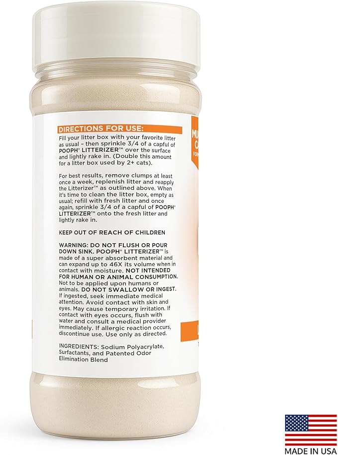 - SIMPLE TO USE, BIG RESULTS: Sprinkle 2-3 tablespoons of Litterizer on top of clean cat litter. Mix together. Litterizer absorbs moisture so you don’t have to remove clumps as often. DO NOT flush this product or the spent litter. Absorbs moisture and extends litter life. Sprinkle and mix to reduce clumping frequency, saving money while maintaining freshness