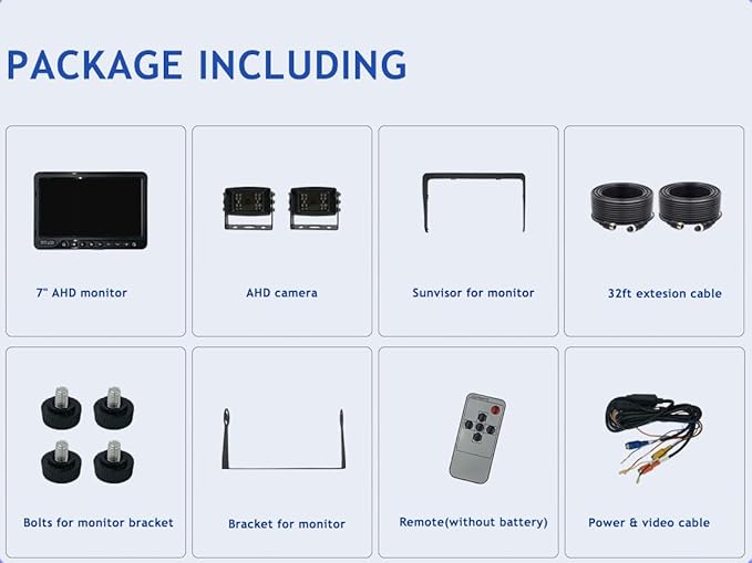- [MONITOR]A 7” LCD AHD 1080P color single view monitor (NOT SPLIT SCREEN) with U-type metal bracket and with 1024RGB x600 HD resolution. This monitor is not waterproof. It is compatible with most of the vehicles with a free power input range DC12-36V and supports with max 3 cameras. TVS device is built in to protect the monitor from being damaged by the transient high power of vehicles. And this monitor only supplies camera which is in use with DC12V, it saves energy.