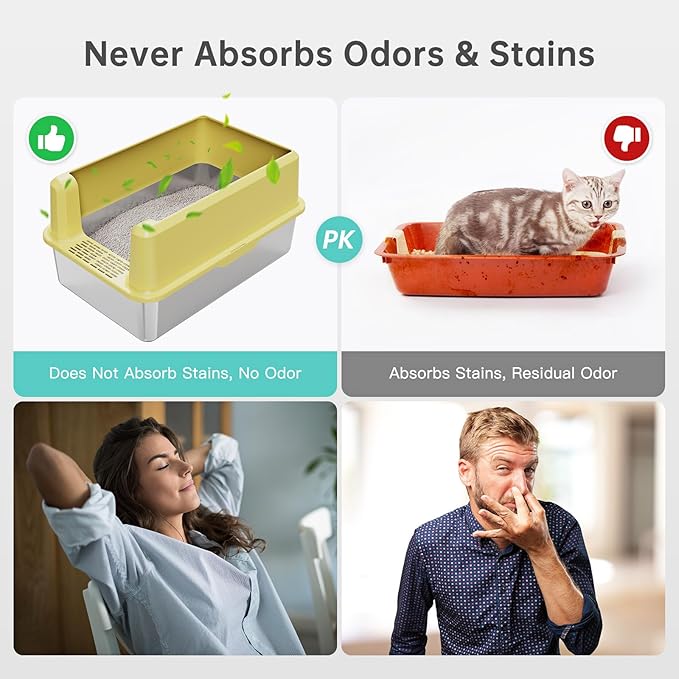 - 【Why Choose Stainless Steel Litter Box!】 Open top litter box made of high-quality ABS high wall and stainless steel litter box, unlike plastic litter boxes, stainless steel litter box with high sides do not collect any residue or odor, are easy to clean, have strong and durable, and do not rust