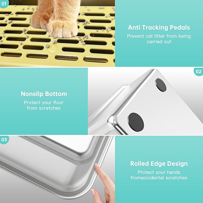 - 【Urine Spilling and Leaking Prevention】The height of the extra large stainless steel cat litter box is 13", with a unique curved high wall design, to protect your cat's privacy and prevent litter spilling and urine leaking. The tracking-proof pedal further prevents litter from being carried out, ensuring a mess-free indoor environment even with a naughty cat
