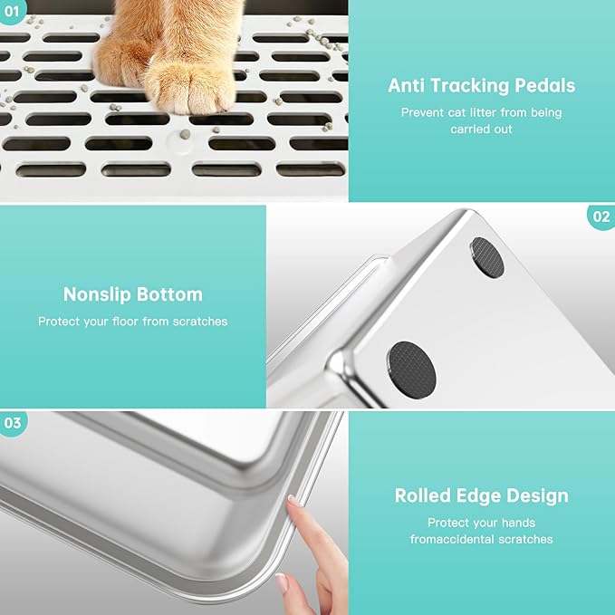 - 【Why Choose Stainless Steel Cat Litter Box!】 The open top large stainless steel litter box for big cats consists of a sturdy enclosed 6inches high sides enclosure and a stainless steel metal cat litter pan. Unlike plastic cat litter boxes, stainless steel metal cat litter box never rusty, won't be scratched and collect any residue or odor, non-stick bottom, are easily to clean, have strong and durable, up to 3-5 years of service life, making it an economical and sustainable solution!