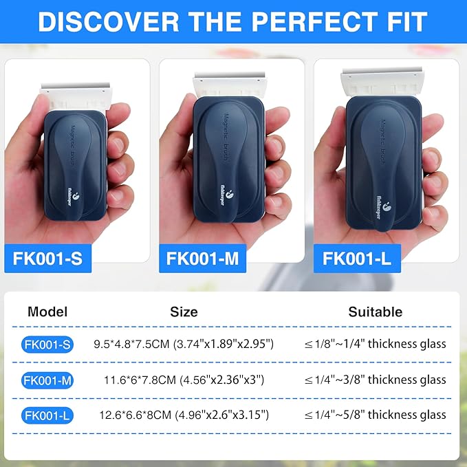 - Powerful Magnetic Force: Our fish tank magnetic brush features a strong magnetic force that securely adsorbed to tanks without the risk of detachment. Designed to fit aquariums with a thickness of 1/8"~1/5"(0.125-0.2in) inches, whether you're removing stubborn dirt or adjusting aquatic plants, our aquarium glass cleaner stays securely in place, making your cleaning tasks more efficient and effortless