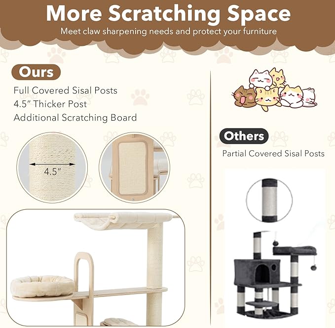 - 【More Scratching Space:】Compared with others using partial covered sisal posts, ours with full covered sisal posts can meet claw sharpening needs and protect your furniture better. Besides, there is an additional scratching board at the side.
