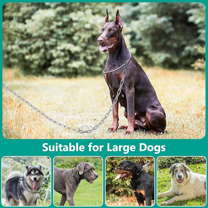 - 【Tangle Free and High Quality】Fine welding makes iron ring perfectly locked each other, which not only improves stability, but also brings flexibility. Unlike ordinary steel core dog cable, it will not tangle even if the dog runs at will. The dog tie out is made of 304 stainless steel, get zinc alloy coating on the surface. With a thickness of 5mm, the dog chain can withstand a maximum tension of 980kgf (9610N) after testing, makes the metal dog leash suitable for dogs up to 180lbs.