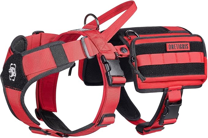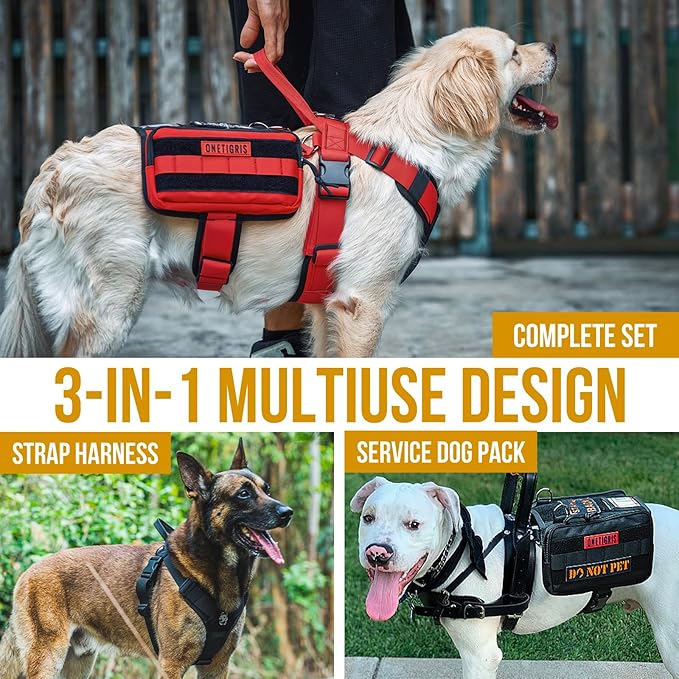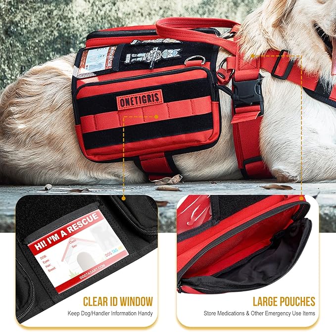 - Comes with an ergonomic strapped harness, saddled canine EDC pouches, with leash clips, MOLLE compatibility, patch panels, clear ID window, and service dog handle attachment D-rings.