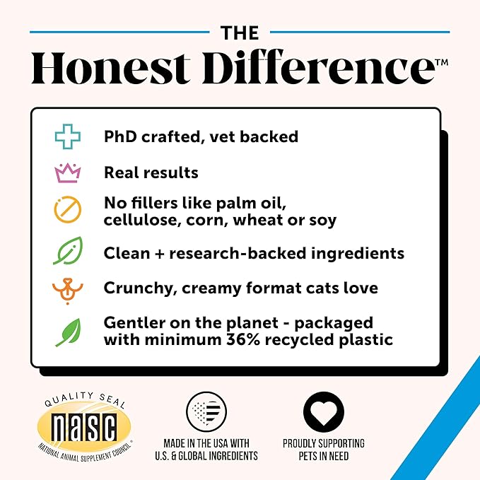 - A TEXTURE AND TASTE CATS LOVE: Pet Honesty’s Skin + Coat Health for cats is a delicious supplement that helps calm, soothe, and nourish skin, so they can feel more comfortable as they pounce & play! Powerful wholesome ingredients are packed inside a unique texture format: it’s crunchy on the outside and creamy on the inside, offering a taste and texture combination that cats love.