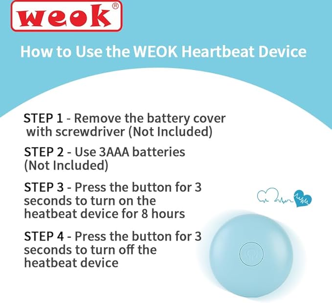 - 【Heartbeat Simulator Module + Plush Toy】The WEOK product contain a plush dog toy and a heartbeat simulator Module. The heartbeat Simulator need 3 AAA batteries(No battery included in the package). Press the button, then the heartbeat module works. Easy to operate.