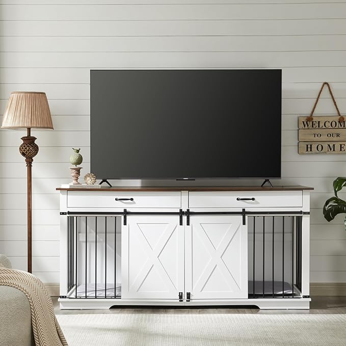 EDYO LIVING 72.5" Large Dog Crate Furniture for 2 Dogs, Wooden Dog Kennel with Drawers, Divider, Sliding Barn Door, Water Resistant Indoor Furniture Style Double Dog Crates, White