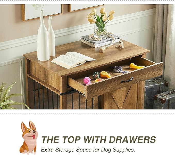 EDYO LIVING 38" Large Dog Crate Furniture with Sliding Barn Door, Wooden Dog Kennel with Drawer for Storage, Water Resistant Indoor Furniture Style Dog Crate for Small/Medium/Large Dog, Rustic Oak