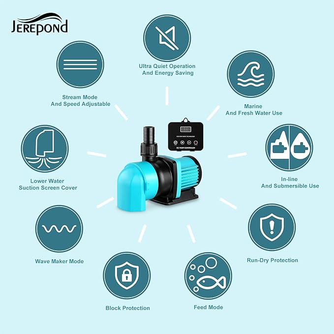 - JEREPOND 1320GPH Max flow aquarium return pump, ECO 35W DC24V return pump with 20 speeds controller, 15 feet max lift;pump dimension (L*Wx*H):7.5*3.5*4.8 inches.3 working modes;