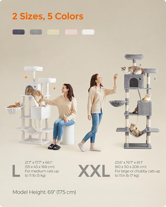 Feandrea Cat Tree, 66.1-Inch Large Cat Tower with 13 Scratching Posts, 2 Perches, 2 Caves, Basket, Hammock, Pompoms, Multi-Level Plush Cat Condo for Indoor Cats, Cream White UPCT165T01