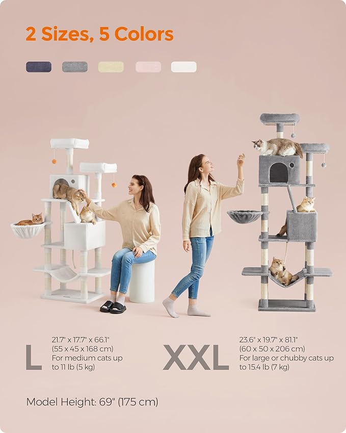 Feandrea Cat Tree, 66.1-Inch Large Cat Tower with 13 Scratching Posts, 2 Perches, 2 Caves, Basket, Hammock, Pompoms, Multi-Level Plush Cat Condo for Indoor Cats, Jelly Pink UPCT165P01