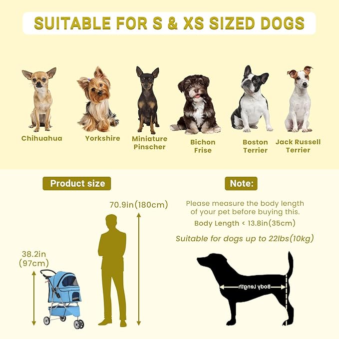 - 【Safe and Comfortable Design】This jogger stroller's handle is soft material and it also features a pad inside the cart for added comfort. With overall size of 35''L x 17.5''W x 38.6''H, Suitable for pets up to 35 lbs,providing a spacious and comfortable space for your pet. 360-degree rotating front wheels with turn lock function, and rear braking system can keep your pet safety.