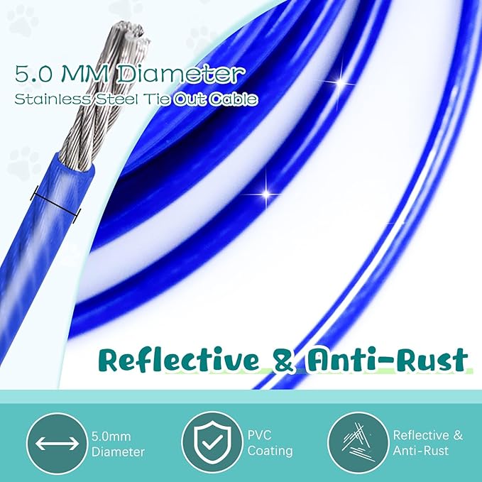 - Anti-Rust and Reflective: The vinyl covering dog runner used in the yard or outdoors and all hardware are made of anti-rust materials. Reflective cable coating can reflect light at night or in low light to ensure the safety of dog.