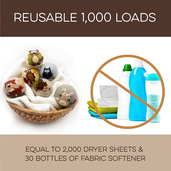 - REUSABLE FOR 1000+ LOADS – REDUCE WASTE: Why keep buying disposable dryer sheets? These cute dryer balls last 1000+ loads, replacing 2000 dryer sheets or 30 bottles of fabric softener. Fluff Ewes dryer wool balls laundry reusable deliver a cost-effective solution for 2-4 years of hassle-free laundry. Make a smarter choice for your wallet and the environment.