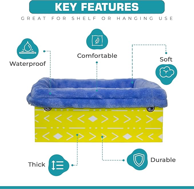 - Small Animal Hammock: A comfortable, secure, and versatile sleep space with this stylish small animal bed. Great small bed, as hanging cat bed for your catio, or Rabbit Hideout. The waterproof and washable cover allows for ferret bedding odor control and easy maintenance. This rat bed or chinchilla hammock is convenient to use in ferret cages or critter nation cages. Fun yellow box and blue blanket combo is designed to keep your small animal cage clean and enjoyable for both you and your pet.