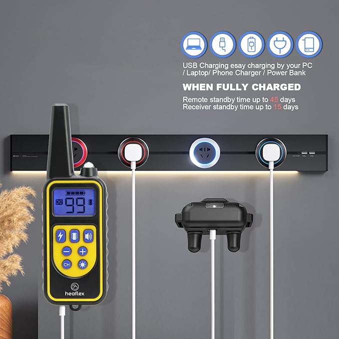- Waterproof and Rechargeable Collar: IP67 wateproof dog shock collar is always ready to train. Rechargeable remote and receiver can be charged together via USB. NOTE: Please do keep the receiver in water for long time, remote control is not waterproof