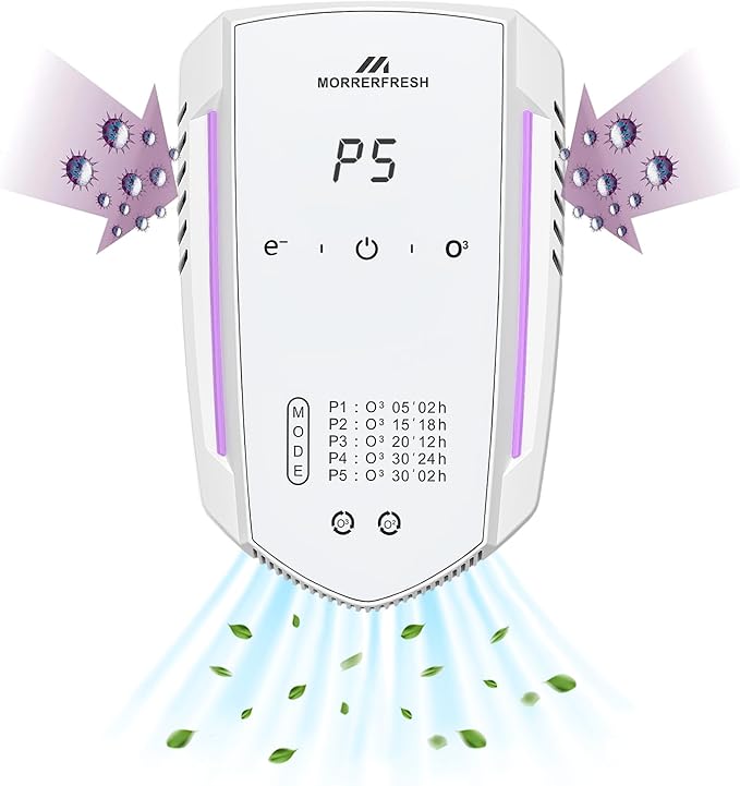 - 5 Adjustable Modes: P1: 5 min ozone, 2-hr pause (50–100 sq. ft.) │ P2: 15 min, 8-hr pause (100–150 sq. ft.) │ P3: 20 min, 12-hr pause (150–200 sq. ft.) │ P4: 30 min, 24-hr pause (200–250 sq. ft.) │ P5: 30 min, 2-hr pause (over 250 sq. ft. or for rapid deodorizing). Tip: If new odors appear during pauses (e.g., cat litter odor), use P5 for the shortest pause time