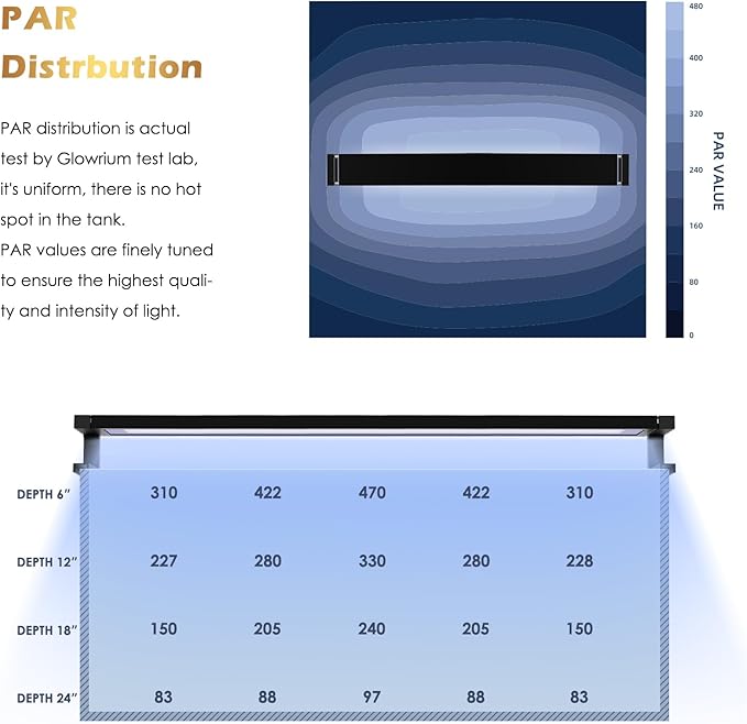 - 【DIY Spectrum and Brightness】Marine Aquarium light features 3 customize spectrum and 0-100% brightness adjustment, allowing you to freely adjust the intensity of each channel and set up your own spectrum for your corals. The marine light ensures precise lighting for optimal growth and health of your corals and fish.