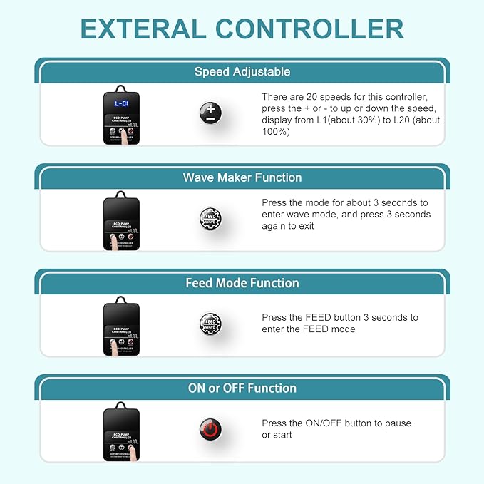 - DC controllable water pump:20 speeds adjustable,control the flow from 30% to 100% of max flow,with 10 minutes feeding mode and wave maker function;