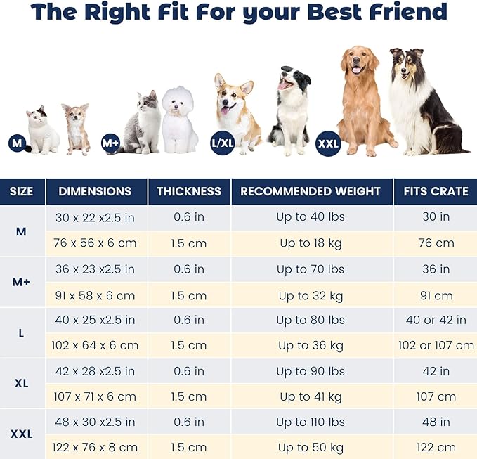 - Optional size and color: (24"x18"x2.5")for pets up to 30lbs; (30"x22"x2.5")for pets up to 40lbs; (36"x23"x2.5")for pets up to 70lbs; (40"x25"x2.5")for pets up to 80lbs; (42"x28"x2.5")for pets up to 90lbs; (48"x30"x23")for pets up to 110lbs.