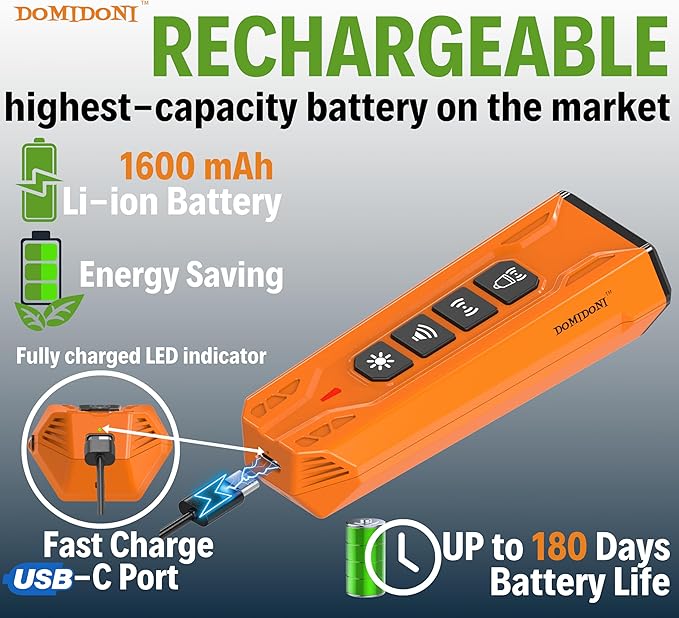 - 🔋Rechargeable and Fast Charging the highest capacity on the market: Dog barking deterrent with a built-in 1600 mAh Li-ion rechargeable battery and fastest Type-C Charging port and up to 180 days' stand-by battery life. Ultrasonic Dog Trainer Device is more than the fastest, safest dog training method available also skip the hassle of keeping yet another device plugged in because it rapidly charges and long-lasting. Fully Charge before using the device.