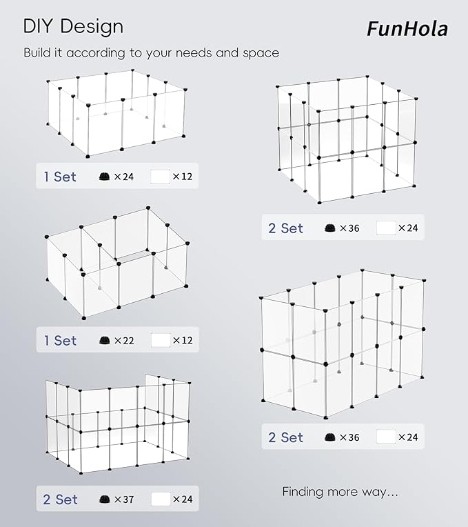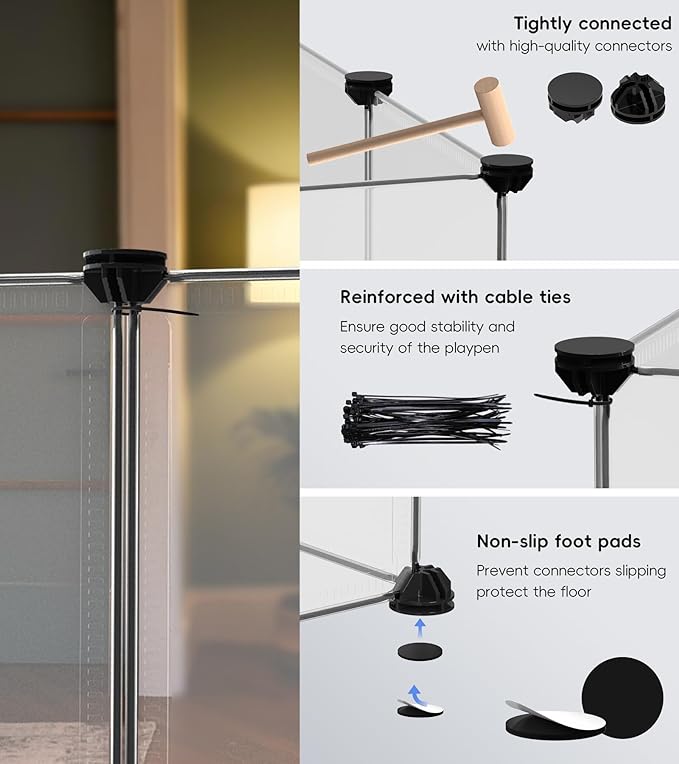 - 𝐒𝐭𝐚𝐛𝐢𝐥𝐢𝐭𝐲 𝐚𝐧𝐝 𝐏𝐫𝐨𝐭𝐞𝐜𝐭𝐢𝐨𝐧: Equipped with 84 nylon straps to securely fasten the small pet fence, and 24 anti-slip mats to prevent the fence from sliding on the floor, providing a stable play area for your pets.