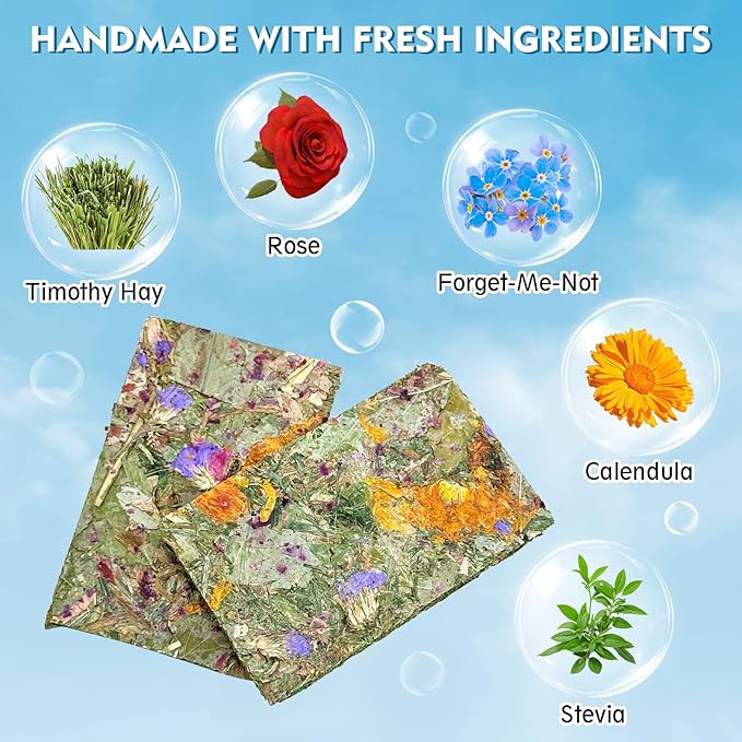 - [Crispy Chew Toys]: Guinea pig chew toys contain a variety of natural ingredients such as timothy hay, forget-me-not, stevia, calendula, rose, providing small animals with multi-faceted nutritional needs. Made by pressing and hot air drying to keep the taste crisp