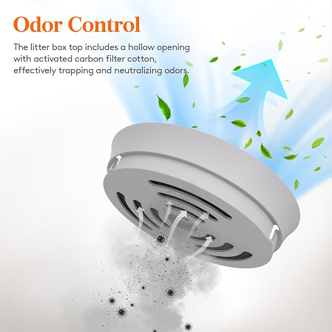 - Odor Control: The top of the litter box features a hollow opening that houses an activated carbon filter cotton which effectively filters odors, ensuring that smells are trapped and neutralized. The activated carbon, measuring 7.9" (20cm) in diameter, can be replaced after use to maintain optimal odor control. Additionally, the closed bin design of the litter box locks trash, dust, and dander within the bin, promoting a clean and tidy surrounding area.
