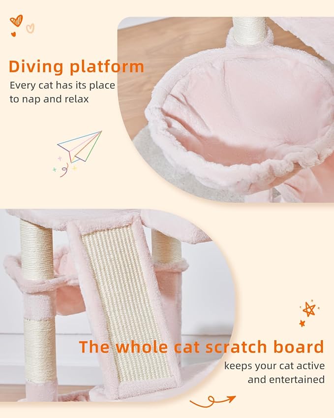 - All-in-one design: There are 5 floors with 2 soft tops, 1 spacious cat apartment, 1 sisal ramp, 1 hammock and 1 hanging basket, natural sisal scratching posts and skin-friendly plush, and a multi-functional cat tree that attracts cats to play and rest.